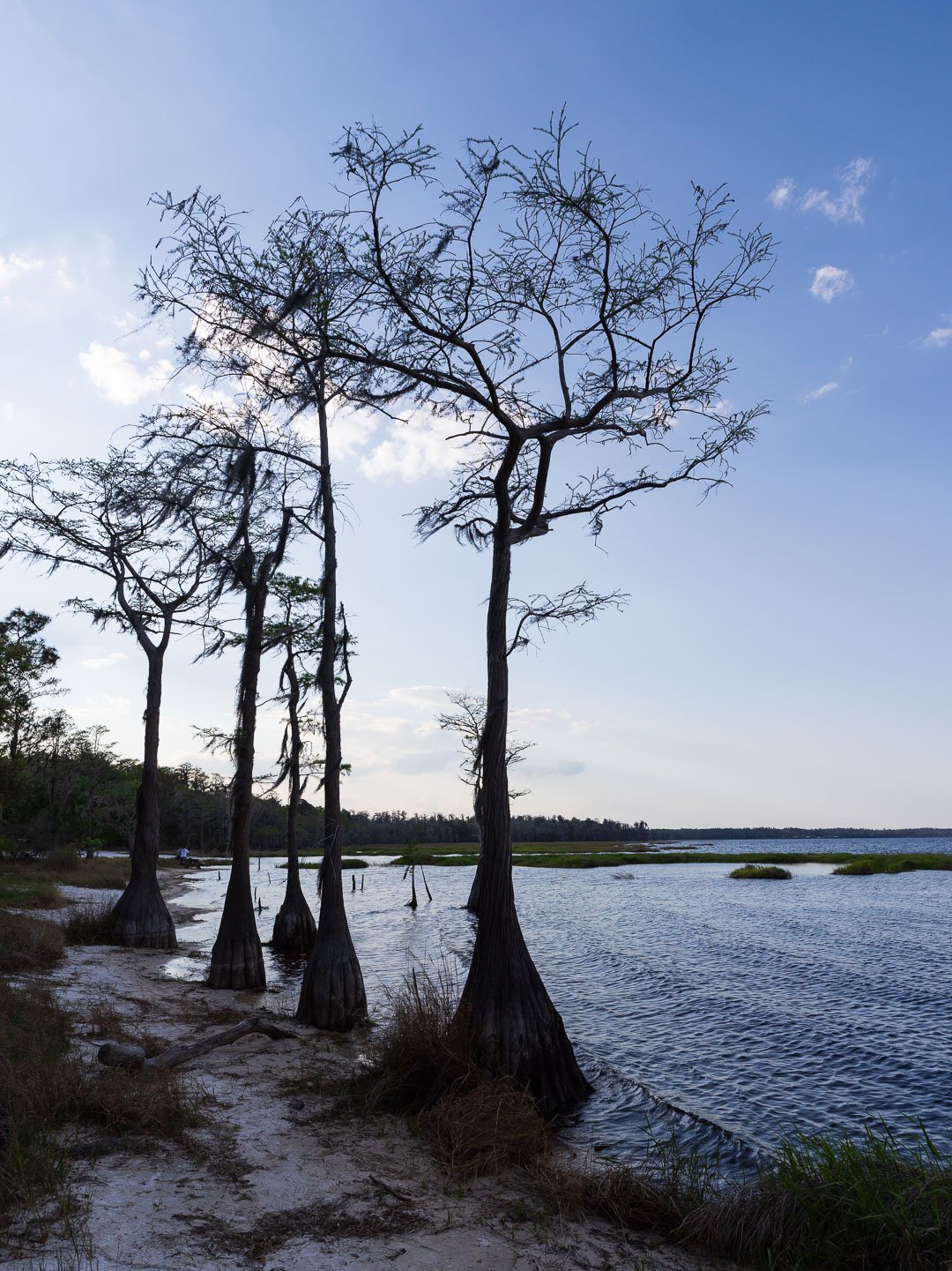Lake Louisa this evening. The shoreline noticeably different, water levels really low. I walked along the edge, flushing damselflies as I went. With the water pulled back, so many cypress trees are exposed now, and you can get much further out than before, just wrapping around the shoreline. Tiny frogs along the lake’s edge, and a gator or two somewhere in the distance making their presence known. No swimming anymore… an algae bloom has been observed. Further on through, blackbird, and a red-shouldered hawk. Crickets starting to chirp as the evening settles in.